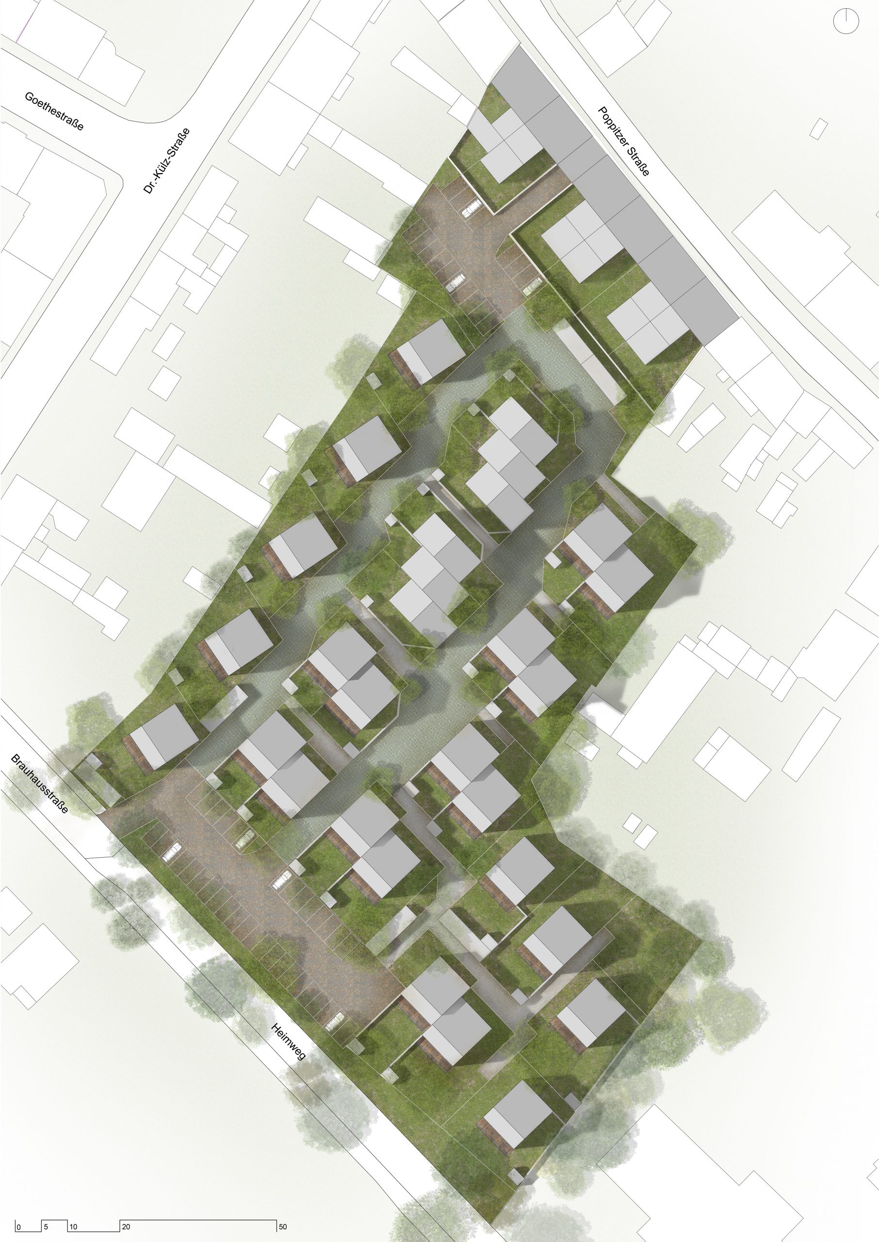 Die Brauhaussiedlung besteht aus ca. 60 Wohneinheiten für bis zu 200 Bewohner:innen. Die 29 Hauseinheiten und 27 Wohnungen sind einheitlich zusammenhängend geplant, aber werden vielseitig modifiziert und bedarfsorientiert umgesetzt. Die überschaubare Größe sowie die abgestimmte Gestaltung sollen das Zugehörigkeitsgefühl zu einer Gemeinschaft stärken und damit zum Wohlbefinden der Bewohner:innen beitragen.